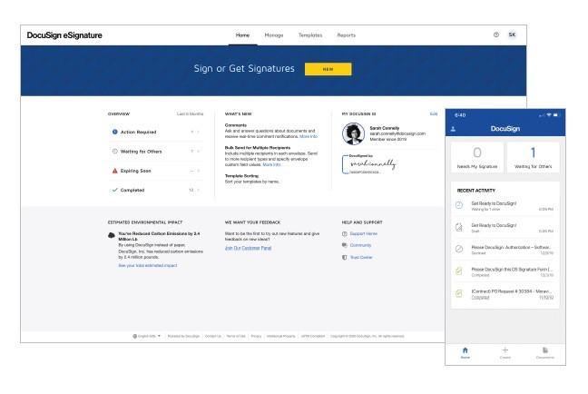 - Envie documentos para assinatura, acompanhe o progresso e obtenha atualizações em tempo real pela Web ou pelo aplicativo móvel mais bem avaliado da DocuSign